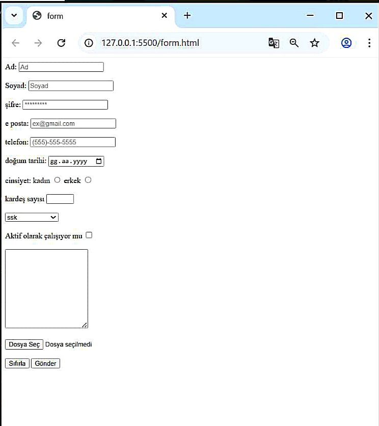 Serimizin son yazısında HTML’de basit bir form yapısını inceliyoruz. Bu form, bir web sitesinde kullanıcıdan bilgi almak için kullanılır. Formun genel amacı, kişisel bilgiler gibi temel verileri toplamaktır. Şimdi adım adım bakalım, bu formun içinde neler bulunur.Form yapısı her zaman <form> etiketiyle başlar. Bu etiketin içine, kullanıcıdan bilgi almamıza yarayan çeşitli alanlar yerleştiririz. Her bir alan, farklı türde veri toplamak için görev yapar.İlk olarak kullanıcıdan ad ve soyad bilgisi alınır. Bunun için iki adet <input type=”text”> etiketi kullanılır. placeholder özelliğiyle, kullanıcıya ne tür bir bilgi girmesi gerektiği örnek olarak gösterilir. Ayrıca required özelliğiyle bu alanın doldurulması zorunlu hale getirilir.Şifre girişi yapılması gerekiyorsa, <input type=”password”> etiketi tercih edilir. Bu, girilen karakterleri gizler. maxlength=”15″ özelliğiyle de en fazla 15 karakter girilmesine izin verilir.E-posta adresi almak için <input type=”email”> kullanılır. Bu alan, girilen verinin e-posta formatına uygun olup olmadığını kontrol eder. Telefon numarası içinse <input type=”tel”> etiketi kullanılır. placeholder ile de örnek bir format gösterilir; örneğin “(555)-555-5555”.Doğum tarihi bilgisi alınacaksa, <input type=”date”> etiketi kullanılır. Bu alan, kullanıcıya takvim arayüzü sunar ve doğrudan tarih seçmesine olanak tanır.Cinsiyet seçimi yapılması gerekiyorsa, <input type=”radio”> etiketlerinden yararlanılır. Bu radio butonlarının her biri bir seçeneği temsil eder. Hepsinin name değeri aynı olduğunda, kullanıcı yalnızca bir tanesini seçebilir. Seçenekler <label> etiketleriyle birlikte gösterilir.Kardeş sayısı gibi sayısal veriler toplamak istiyorsak, <input type=”number”> etiketini kullanırız. min ve max özellikleriyle girilebilecek sayı aralığı belirlenir.Sigorta türü gibi sabit birkaç seçenekten birini seçtirmek istediğimizde, <select> etiketi kullanılır. Bu etiketin içinde yer alan <option> etiketleriyle seçenekler sunulur. Kullanıcı, listeden bir tanesini seçer.“Aktif olarak çalışıyor mu?” gibi evet/hayır tarzı sorular için <input type=”checkbox”> kullanılır. Kullanıcı bu kutuyu işaretleyerek onay verir ya da boş bırakır.Daha uzun açıklamaları almak için <textarea> etiketinden faydalanırız. cols ve rows özellikleriyle bu metin alanının genişliği ve yüksekliği belirlenir.Kullanıcıdan bir dosya yüklemesini istediğimizde ise <input type=”file”> etiketini kullanırız. Eğer sadece belirli türde dosyaların yüklenmesini istersek, örneğin sadece PDF dosyaları, o zaman accept=”.pdf” özelliğini ekleriz.Formun en sonunda iki tane buton bulunur. <input type=”reset”> butonu formdaki tüm alanları temizler, yani formu sıfırlar. <input type=”submit”> ise formu gönderir.İşte, HTML ile hazırlanan bu örnek form, kullanıcıdan temel bilgileri toplamak için oldukça uygun bir yapıdır. Web sitelerinde form yapıları çok önemli yer tutar. Siz de bu yapıdan yola çıkarak kendi projelerinizde benzer formlar tasarlayabilirsiniz. Gördüğünüz gibi, HTML’de form oluşturmak hem mantıklı hem de sistematik bir süreçtir.